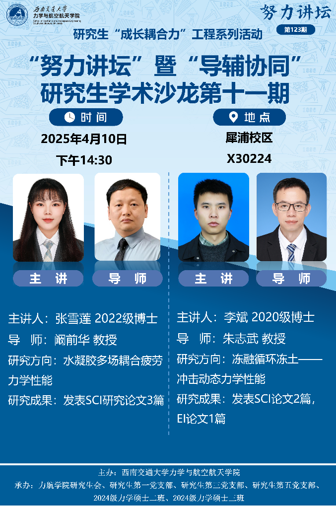 “努力讲坛”暨“导辅协同”研究生学术沙龙第十一期在犀浦校区X30224举行。学院副院长阚前华、党委副书记孔祥彬、辅导员安晟斐及众多研究生参与本次沙龙。主讲人为学院研究生第三党支部成员、2020级博士生李斌和研究生第一党支部成员、2022级博士生张雪莲。沙龙由学院研究生第三党支部书记胡持主持。