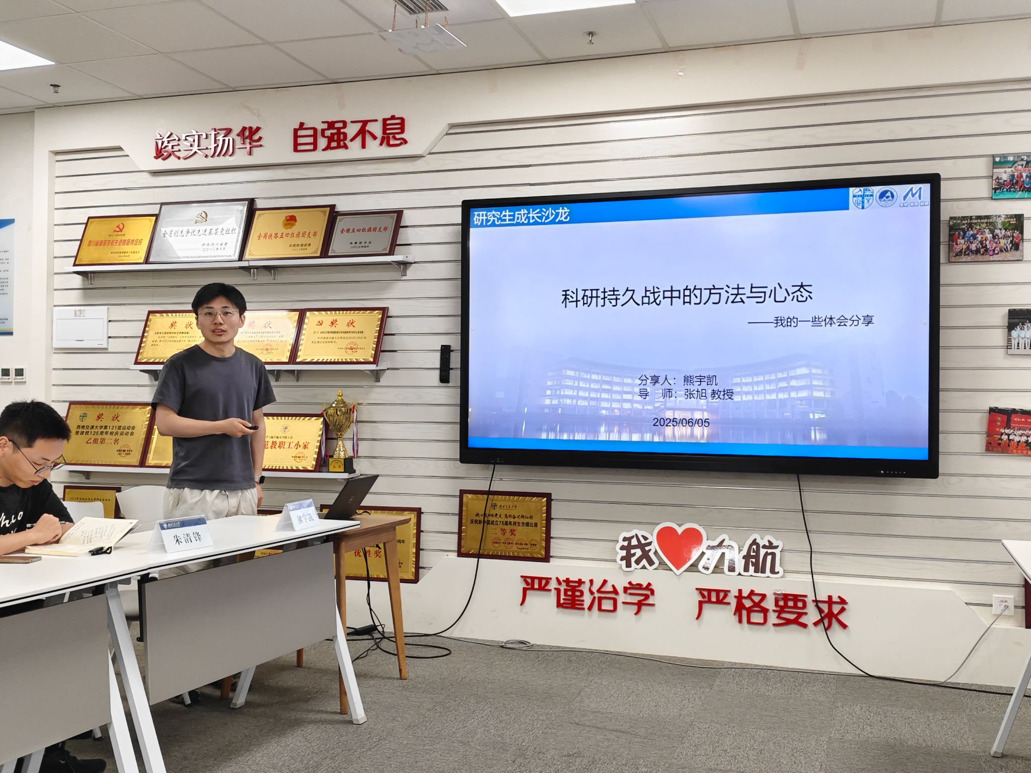 首先是研究生分享环节。熊宇凯以“科研持久战中的方法与心态”为题展开分享。他回顾了自己的科研经历,从如何选题、如何面对阶段性没有成果、如何面对专家的质疑等方面分享,特别强调了合作和稳定科研的重要性,提到不仅要和课题组其他同学合作,更要和国内外课题组交流合作,互取所长。