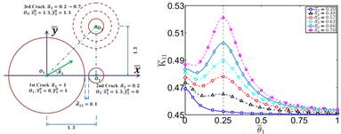 图2三裂纹的示意图(a);不同情况下裂纹1周围的应力强度因子(b)