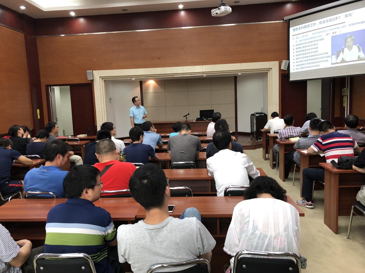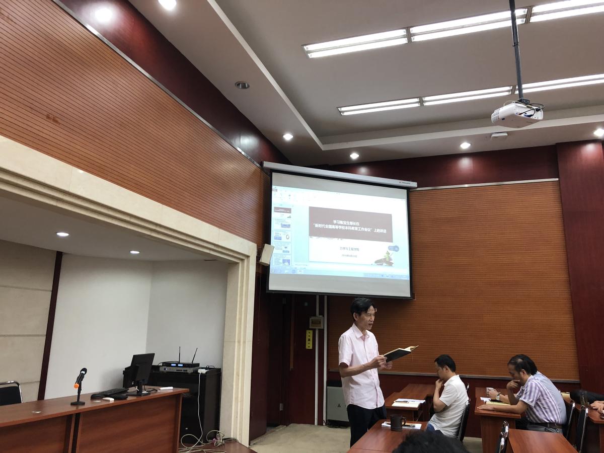 学院党委金建明书记要求,全体人员要结合工作实际,坚持以习近平新时代中国特色社会主义思想为指导,全面贯彻党的教育方针,进一步落实立德树人根本任务,全面深入贯彻陈宝生部长讲话精神,把思想和行动统一到本科教育发展的新要求新任务上来,推动学校本科教育建设发展再上新台阶。