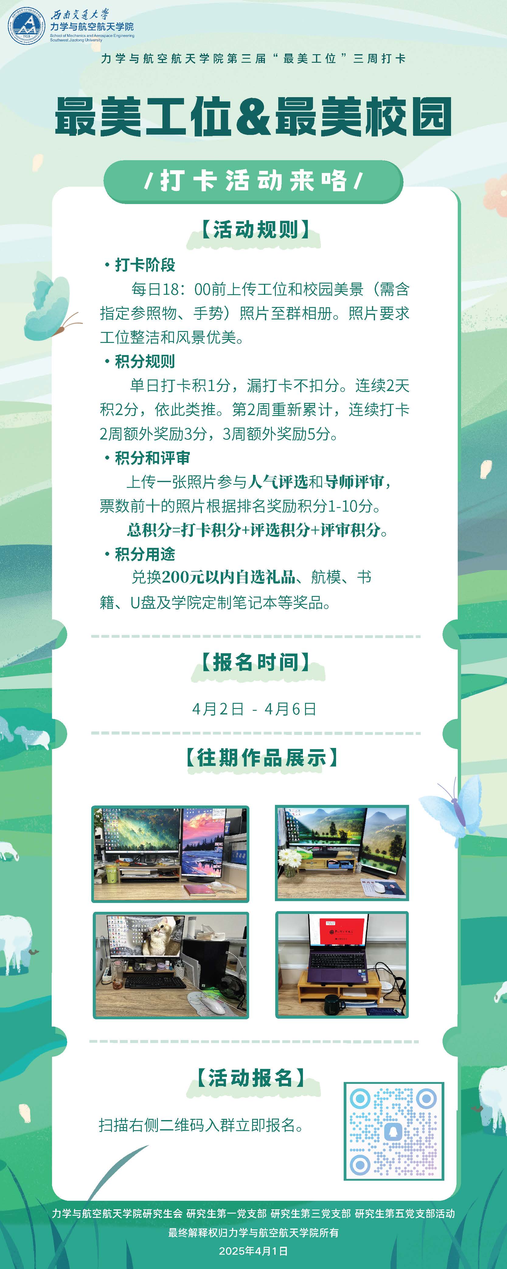 2.打卡阶段:4月7日-4月27日。秉持“公平公正公开”的原则,设置公开相册用于收集打卡照片。参评同学需在当天18:00前上传工位照片和校园美景打卡照片,工位要求整洁有序,照片需能看清桌面全貌。