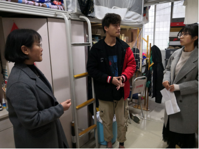 栗民书记叮嘱同学们务必要注意宿舍安全问题,切勿使用“小太阳”等不安全的电器,同时,期末考试临近,要抓紧时间好好复习,为本学期的学习交上满意的答卷。辅导员老师们逐一对各个宿舍进行了检查,强调学校、学院的相关规章制度,明确对发现违纪行为的同学,将根据学校和学院规定严肃处理。