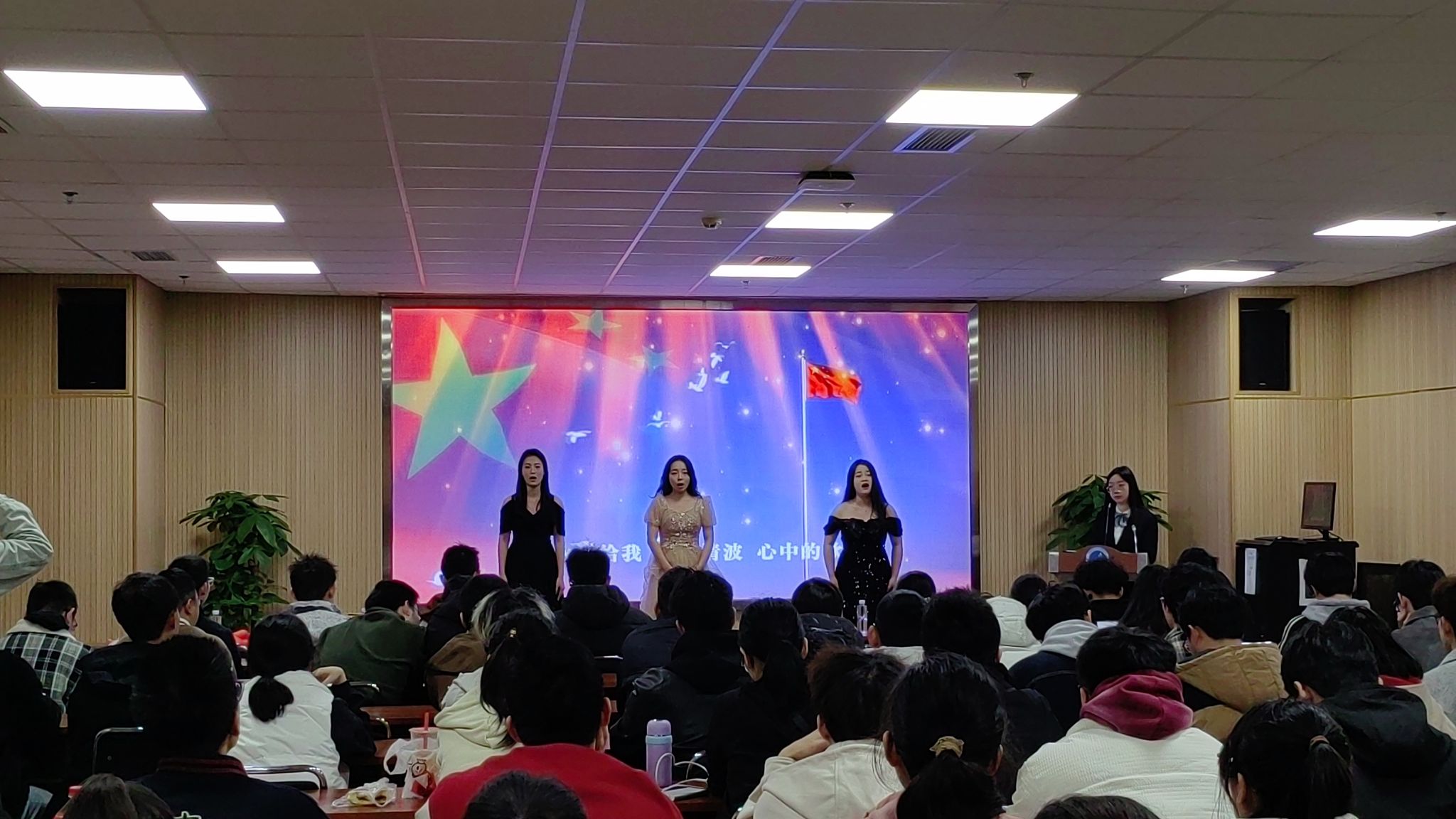 活动第一项,《我和我的祖国》讲演团为大家带来精彩合唱曲目。三位同学以清朗的歌声演绎经典旋律,舞台背景用暖色灯光勾勒出祖国山河。在婉转而真挚的歌声的感染中,同学们热情高涨,爱国之情涌入心头。