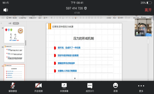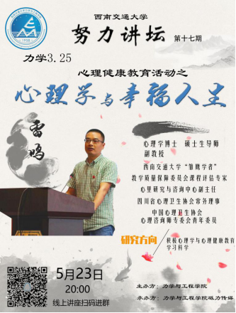 心理研究与咨询中心副主任雷鸣副教授为同学们开展“心理学和幸福人生”专题讲座。本次讲座通过学院“努力讲坛”以线上讲座方式开展,学院党委副书记孔祥彬以及力学学院各年级本研同学参加了讲座,讲座由戴航岑同学主持。