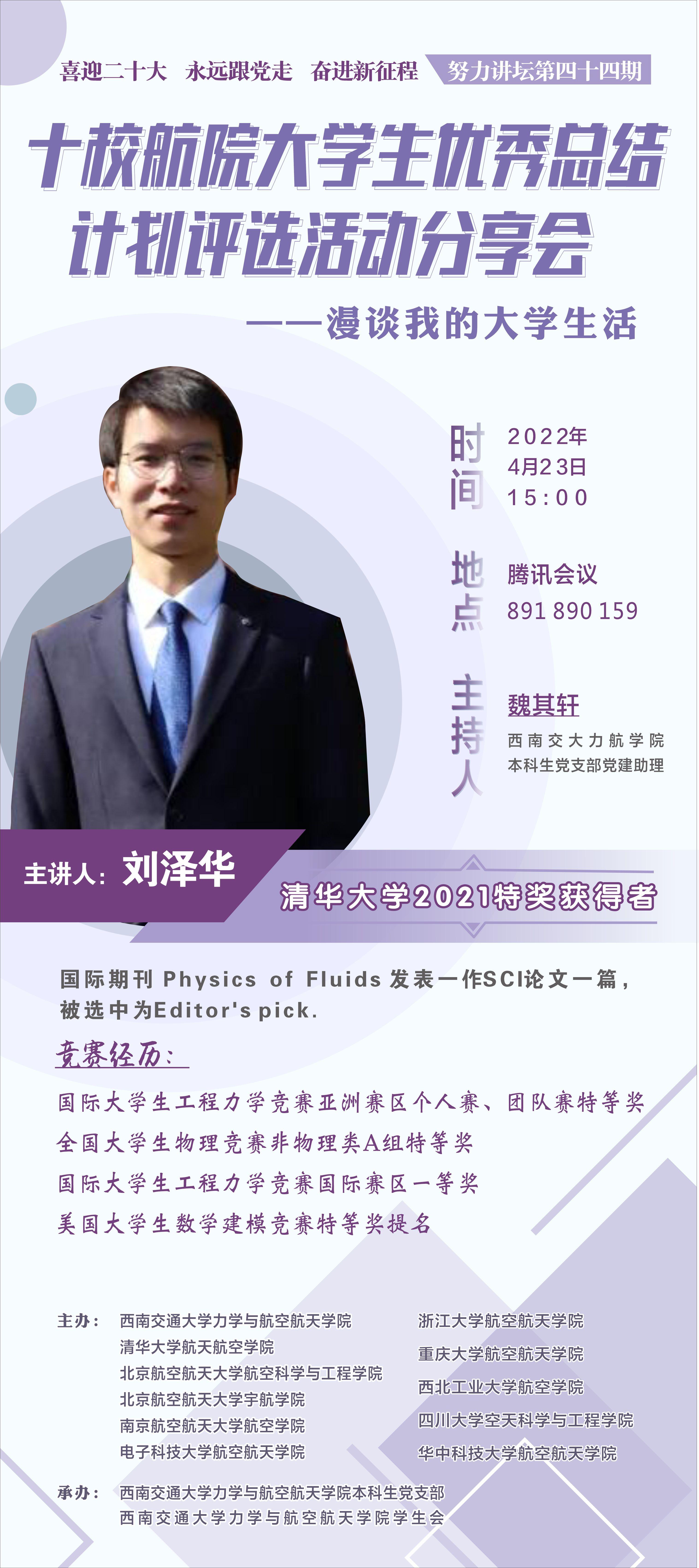 2022年4月23日下午,十校航院大学生优秀总结计划评选活动分享会暨“努力讲坛”第四十四期“漫谈我的大学生活”顺利开展,本次活动由西南交大、清华、北航、南航、浙大、西工大、华科、川大、重大、电子科大十校航院主办,西南交通大学力学与航空航天学院本科生党支部、学生会承办。本次活动以线上分享的方式进行,主讲嘉宾为清华大学航天航空学院2018级本科生、清华大学2021特奖获得者刘泽华,本次活动由麻豆做爱