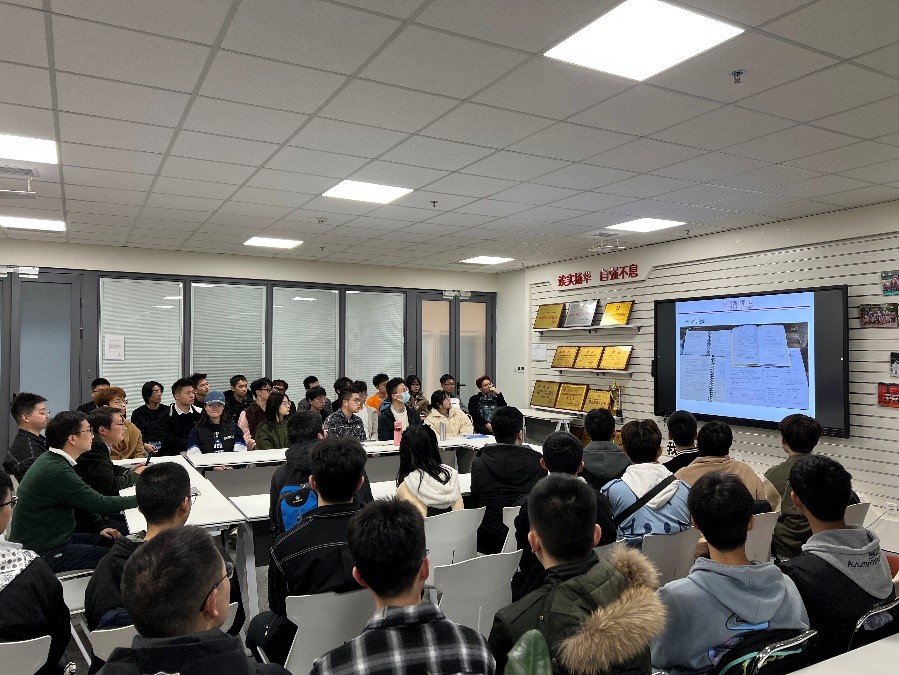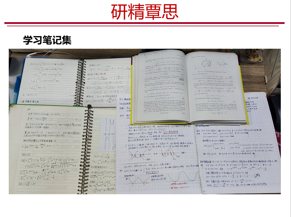 然后,他分享了《北齐书·冯伟传》中“闭门不出将三十年,专精覃思,无所不通”这段典故,引出课程第一个主题:研精覃思。他向大家展示了自己课程学习笔记、在法国读博期间的读书笔记以及自己指导研究生反复修改论文的过程稿等,鼓励大家一定要认认真真读文献、工工整整记笔记、扎扎实实做研究。