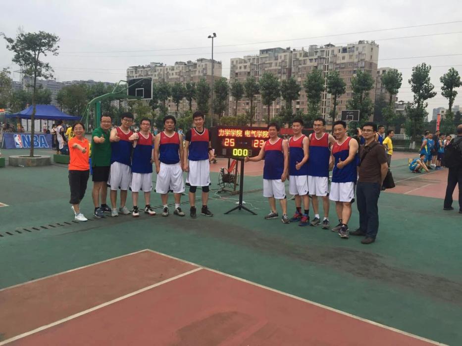 2017年6月6日在西南交大犀浦校区篮球场停摆十几年的教职工篮球赛终于拉开战幕。力学与工程学院在康国政院长和刘菲主席的组织和参与下组队参加了本赛事。我们被分在了C组,有实力强大的机关一队和后勤集团队。我们的队伍虽然年龄偏大,场上主力队员三位四十岁以上,但他们的球技不输给年轻人。康国政院长年轻时也是位篮球爱好者,近年来也长期坚持组织自己科研团队的老师和研究生进行篮球友谊赛,所以球感较好,并场场打满全场,可谓是绝对的主力。首场比赛对阵物理学院,40.5:20.5轻松拿下比赛。首场比赛的胜利给了我们些许的信心。第二场小组赛对阵实力强大的后勤集团,在后勤的严加防守下,我们打不出默契的配合,后勤队配合默契,很快控制了局面,最后我们不敌对手以12.5:30败北,比分意外悬殊,信心受挫。第三场对本组最强的机关一队,由于主力康院长有会不能参加,实力削减,替补上场,部门工会委员范晨光老师和新进老师胥奇老师有机会上场,他们表现神勇,超水平发挥,配合场上主力谷丽瑶、朱志武、储节磊很好地完成了比赛。小伙子们完全放开了,打得酣畅淋漓,最后居然拿下39分,虽然比赛输了,但虽败尤荣。周末休息后,迎来了最后一场小组赛,6月12日周一与电气学院争小组第三。刚开始我们打得比较紧,四比九落后。经过调整后,追上比分,上半场结束时比分持平。下半场比赛更加紧张,两队比分一直咬得很紧,交替上升,最后我们以25.5:23小胜,拿到了预期的小组第三。