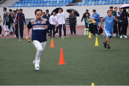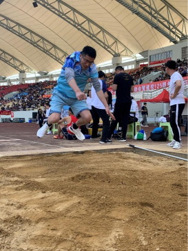 青年教师刘俊杰老师,在教工乙组男子400米决赛中,一马当先,一举夺魁。实验中心储节磊老师以2米57的好成绩拿下教工乙组立定跳远的冠军。