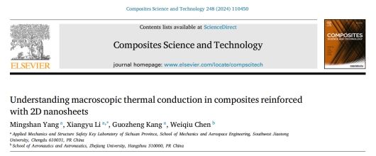 李翔宇教授课题组在二维纳米片增强复合材料的宏观导热性能研究方面取得进展,相关成果以“Understanding macroscopic thermal conduction in composites reinforced with 2D nanosheets”为题发表在国际复合材料领域的顶级期刊《Composites Science and Technology》(中科院一区TOP,IF:9.1)。博士研究生杨名山为第一作者,李翔宇教授为通讯作者,合作作者包括麻豆做爱