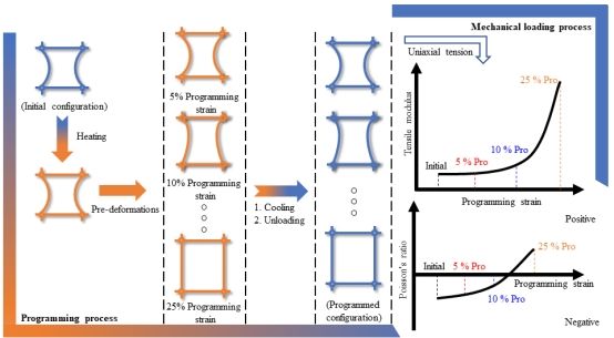 然而,目前可编程点阵结构性能调控研究主要集中于实验分析,重点讨论在编程前后结构的性能差异,而对于性能转变机理的研究还比较匮乏。同时,团队在前期研究中发现,通过热-机械加载的形状记忆编程方法往往会对基体材料性能产生不可忽视的影响。然而,相关的性能调控研究通常忽略了上述因素,只关注到结构的转变,这势必会对结构性能调控产生干扰。