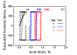 图2 实验和模拟结果对比:(a)圆形路径,(b)蝶形路径和(c)矩形路径的等效剪应力-轴应变曲线;(d)棘轮应变-循环周次演化曲线