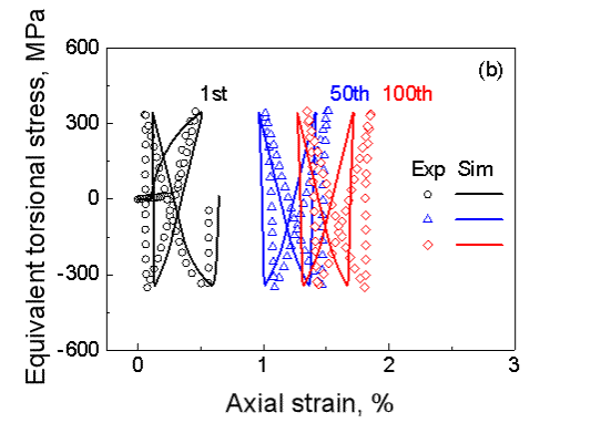 本文在经典晶体塑性框架的基础上,提出了一个新的细观尺度非比例参数,并对各向同性硬化和随动硬化模型进行了修正。使用该模型结合薄壁圆管有限元模型,对U75V钢轨材料在单轴和多轴循环加载下的循环变形行为进行了预测。结果表明,该模型能较好地反映U75V钢轨材料在应变控制单轴和多轴循环载荷下的循环软化向循环硬化的转变过程,以及应力控制下单轴和多轴循环载荷下的棘轮行为。