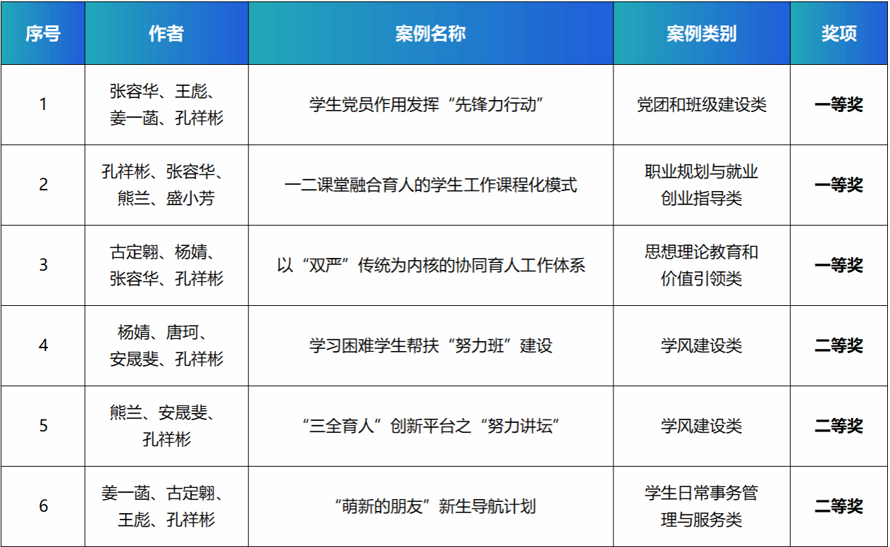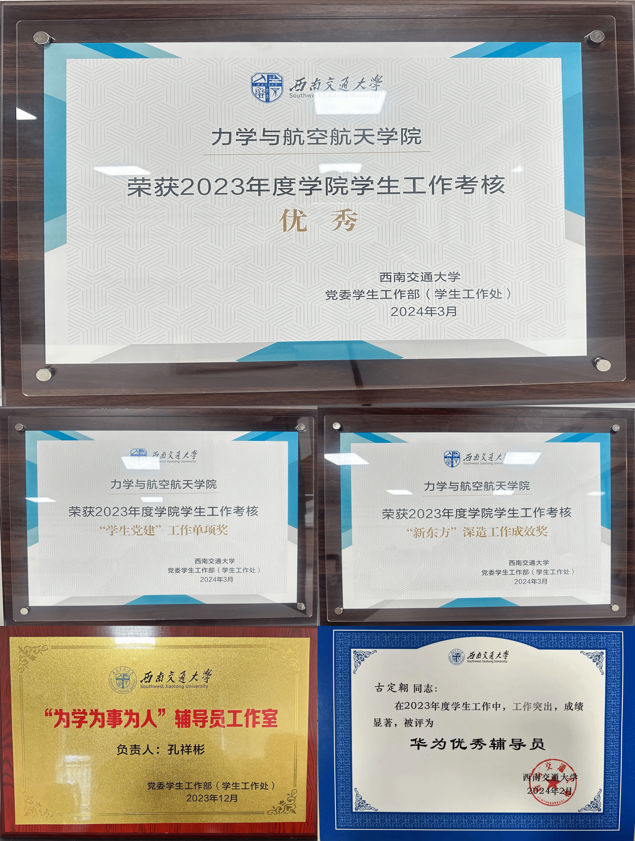荣获2023年度学生工作考核优秀奖、“学生党建”工作单项奖和“新东方”深造工作成效奖,申报的“为学为事为人”辅导员工作室获批,报送的6个辅导员工作案例获得一等奖3项、二等奖3项,学院辅导员古定翱荣获2023年度“华为优秀辅导员”称号。