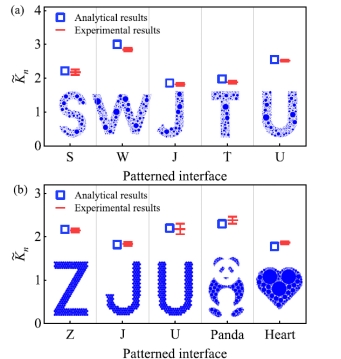 。理论和实验同时采用由多个不同半径的压头填充的图案。(b) 具有字母Z、J、U及定制化的熊猫和心形图图案接触界面的归一化接触刚度。理论模型采用由多个不同半径的压头填充的层级图案,而实验则直接采用单一结构的接触界面。