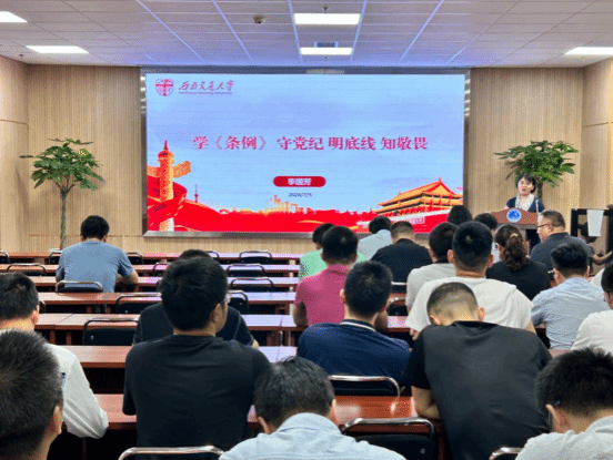 会议第一阶段为党员大会,会议邀请了学校纪委副书记李国芳为学院全体教师党员进行了一场题为《学<条例> 守党纪 明底线 知敬畏》的党纪学习教育。李国芳从加强党的纪律建设的重大意义,《中国共产党纪律处分条例》的主要内容以及高校违纪违法典型案例三个方面对全院教师党员进行了一场深刻、生动的党纪教育。