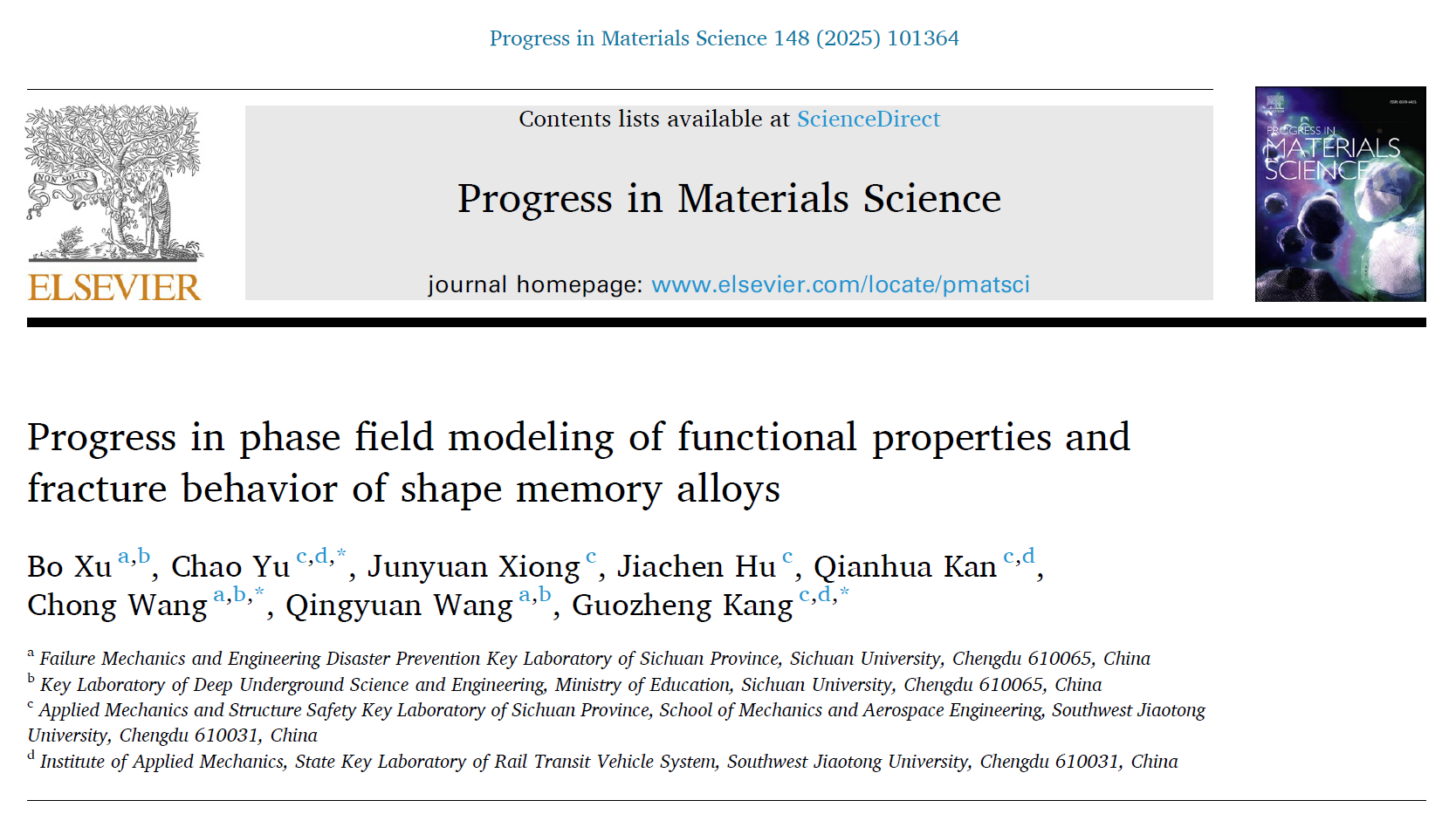 近日,西南交大康国政教授团队在顶级综述期刊Progress in Materials Science(IF = 33.6)上发表了题为“Progress in phase field modeling of functional properties and fracture behavior of shape memory alloys”的综述论文。已毕业博士生徐波(现就职于四川大学)为论文第一作者,西南交大康国政教授、于超教授和四川大学王宠教授为论文共同通讯作者,西南交大阚前华教授、四川大学王清远教授和西南交大麻豆做爱