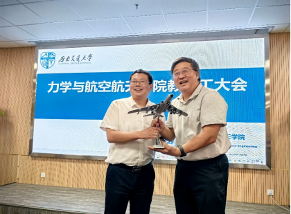 接下来,举行了轰机模型捐赠仪式,蔡力勋老师向学院捐赠了一架珍贵的轰机模型,该模型由轰-6K首飞功勋试飞员单有生签名,十分具有纪念意义。院长李翔宇代表学院对蔡老师的大力支持表示了由衷感谢。