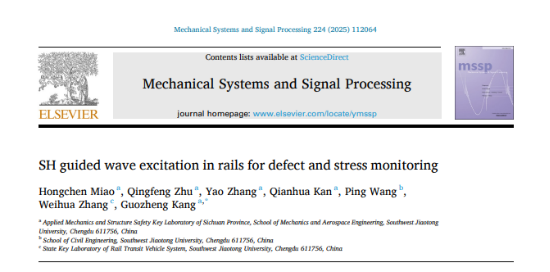 康国政教授团队在钢轨导波监测领域取得重要进展,相关成果以“SH guided wave excitation in rails for defect and stress monitoring”为题发表在工程动力学领域顶级期刊《Mechanical Systems and Signal Processing》(中科院一区,IF: 7.9)。论文第一作者是康国政教授团队波动力学与结构健康监测研究小组负责人苗鸿臣副教授,康国政教授为论文的通讯作者,合作者还包括麻豆做爱