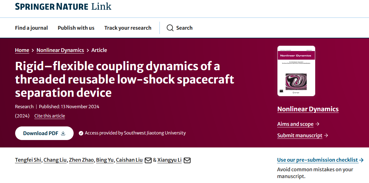 李翔宇教授课题组在航天器机构动力学方面取得进展,相关成果以“Rigid-flexible coupling dynamics of a threaded reusable low-shock spacecraft separation device”为题发表在动力学领域期刊《Nonlinear Dynamics》。麻豆做爱