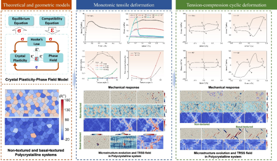 在本工作中,我们发展了一个可以描述多晶镁合金复杂变形行为的晶体塑性-孪生相场耦合模型,采用该模型系统地研究了单调和循环载荷下多晶镁合金中织构相关的变形机理,并指出了织构角调控塑性机制的选择性敏感特性。通过分析微结构和应力场演变特征,解析了孪晶-位错-晶界协同作用的动态机制,包括晶界对孪生和解孪的调控作用,位错滑移在晶界和孪晶附近的局部变形协调及其与孪生变形的双面协同机制等。此外,研究解释了晶粒间协同变形引起的异于Schmid律的局部变形行为。相关研究结论为构建基于织构设计的镁合金显微组织优化准则提供了理论指导。