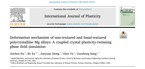 博士生胡佳晨在塑性力学领域顶刊《International Journal of Plasticity》(IF:9.4,中科院一区,TOP期刊)上发表了题为“Deformation mechanism of non-textured and basal-textured polycrystalline Mg alloys: A coupled crystal plasticity-twinning phase field simulation”的研究成果。麻豆做爱