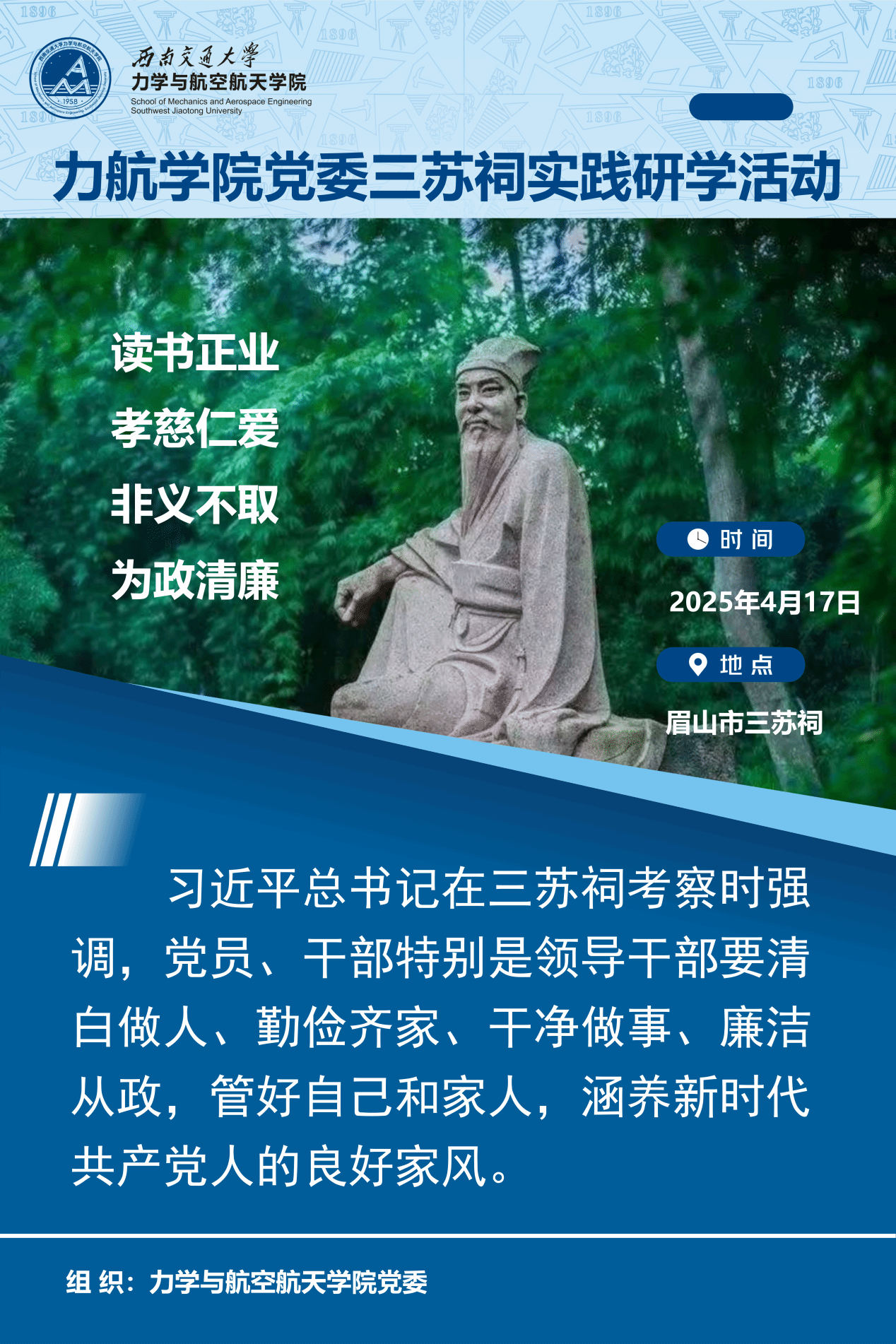 党委书记栗民书记带领,组织学院教师党员前往眉山市三苏祠开展了一场富有教育意义的党建实践研学活动。此次活动以 “读书正业、孝慈仁爱、非义不取、为政清廉” 为主题,旨在通过对三苏文化的深入学习,进一步加强党员教师的党性修养,弘扬优良家风,强化廉洁自律意识 。