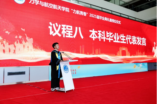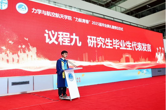 李汨剑同学作为研究生代表发言,他回顾七年求学时光,感恩母校、学院及导师栽培,强调科研历程中积累的学术素养,展望未来,呼吁同学们将个人理想融入时代使命,在祖国需要处绽放光彩。