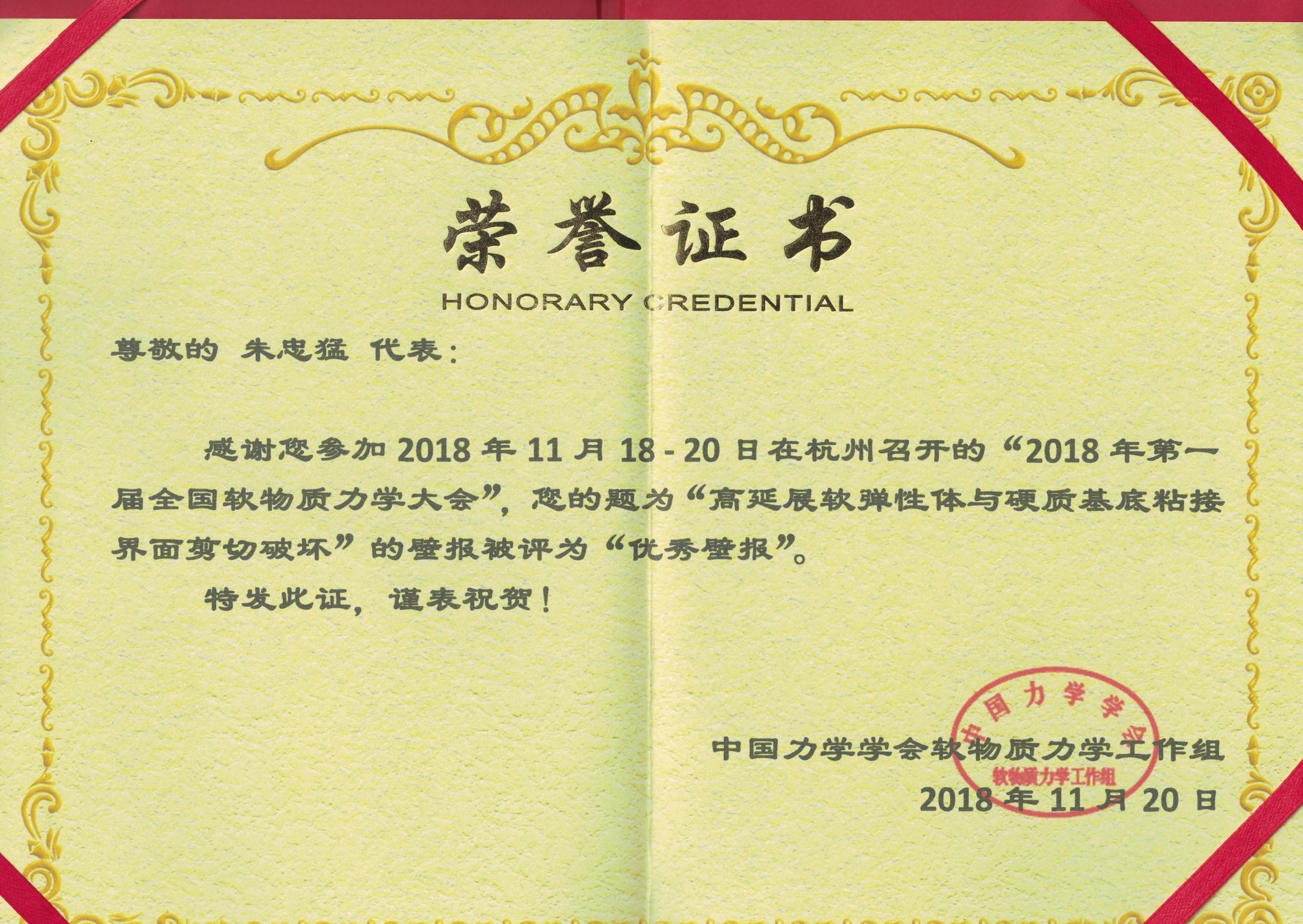 朱忠猛博士与来自浙江大学、复旦大学、同济大学、北京理工大学、华南理工大学等高校的40位教师、研究生同台竞争,最终脱颖而出,成为第一届全国软物质力学大会“优秀壁报”奖的5名获奖者之一。