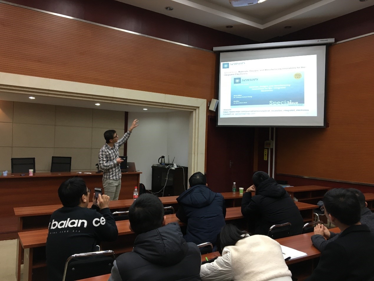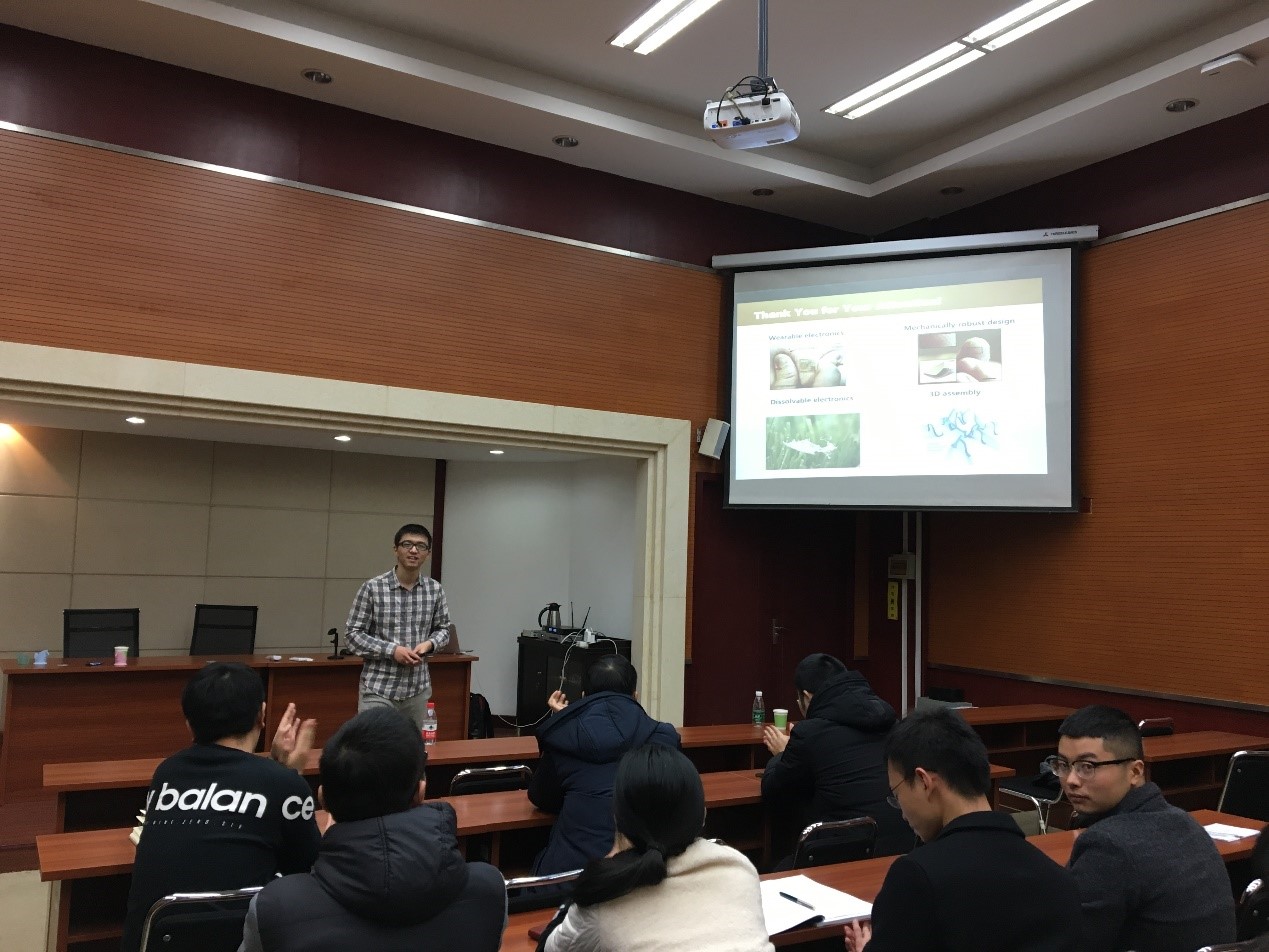 进行学术交流,并作了题为“Dissolvable Tattoo Electronics for Biomedicine”的学术报告。程博士首先综述了柔性电子相关的前沿研究,包括先进转印技术、生物复合材料设计、多级微结构设计、三维组装等;接着重点介绍了可降解柔性电子的概念以及他近年来在可降解柔性电子方面的创新研究成果,包括可降解电子器件的力学设计及结构优化、可降解生物医疗传感技术、可降解集成电子等;最后对柔性电子尤其是可降解电子在人体健康监测及医疗等方面的潜在应用进行了展望。该报告引起了麻豆做爱