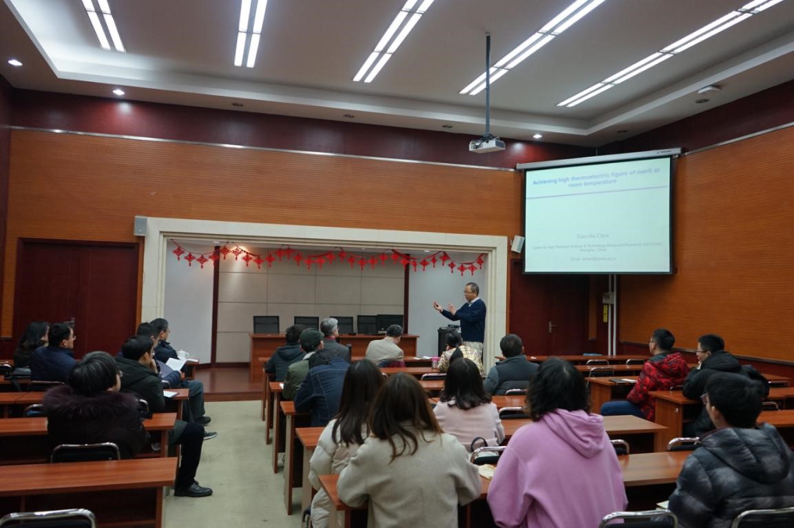 陈晓嘉研究员以“Achieving high thermoelectric figure of merit at room temperature”为题,首先介绍了热电材料的概念及应用前景。热电材料是利用固体内部载流子运动实现热能和电能直接转换的功能材料,可以用于制作温差发电机或电制冷装置,在军事、航天航空、医疗、工业、光电、通信等领域有广泛的应用前景。随后介绍了表征热电材料热电转换效率的重要指标——品质因子zT值及其影响因素——材料的电子结构和载流子的散射情况。接着重点介绍了几十年来科学家为提高zT值所做的相关工作以及他们在这方面取得的创新研究成果。针对室温下最大zT值约为1的门槛,陈晓嘉研究员通过引入高压使热电材料发生电子拓扑相变,从而使其zT值有大幅提升,可达到1.7。这一创新工作为提高热电材料zT值提供了一种新思路。