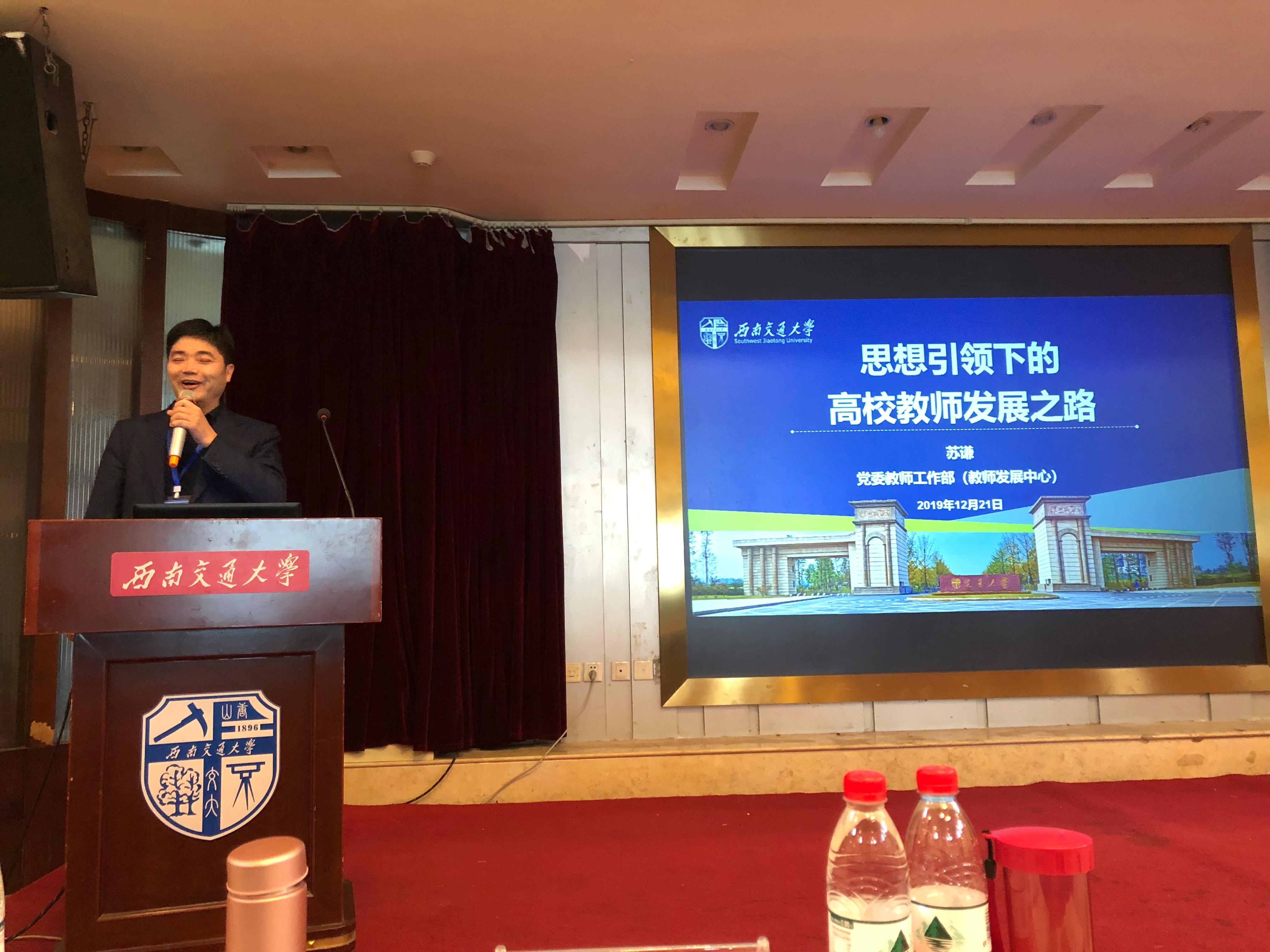教师工作部部长苏谦教授分享了报告“思想引领下的高校教师发展之路”,介绍了西南交大的发展、师德师风建设、教学理念教学范式和教学方法的发展以及西南交大教师发展中心为教师服务和教学能力提升所做的工作。为学院下一步师德师风建设,注重高位引领与底线要求结合、严管与厚爱并重,不断激发教师内生动力,提供了路径。