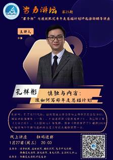 2021年1月27日20:00,力学与工程学院党委副书记、君子(虚拟)书院负责人、学校“青年讲师团”成员孔祥彬老师受邀做客“努力讲坛”第二十五期,讲座主题为“慎独与自省---谈如何写好年度总结计划”。本次讲座由力学与工程学院研究生会承办,是“君子杯”七校航院优秀年度总结计划评选活动第一次辅导讲座,来自麻豆做爱