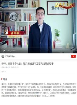 该视频从毛泽东担任北京大学图书馆馆员工资有8块大洋说起,讲述了月收入近300大洋的北京大学图书馆主任李大钊同志如何将自己的高收入用在支持革命事业和资助学生上,而自己却“黄卷青灯,茹苦食淡;冬一絮衣,夏一布衫”,乃至牺牲后家里遗产仅有1块大洋的感人故事。