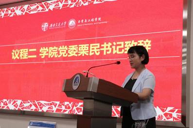 学院党委书记栗民致新生欢迎词。栗民书记首先对2021级全体新生表示热烈的欢迎,并对新生提出殷切希望:希望同学们能关注身体健康,在努力学习的同时不忘积极锻炼;在生活中,能主动拓宽人际交往圈,善交益友、诤友促进个人成长;希望新生能够在大学四年的时光中努力追寻自己的梦想,实现个人价值;