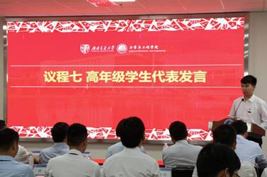 研究生会主席王翰文作为高年级代表分享了自己大学生活的心得体会。他呼吁新生要打牢基础,踏踏实实学好每一门基础课程,在未来更深度的学习过程中才能事半功倍。同时培养自己的兴趣爱好,结交新朋友,勇于尝试,不断挑战自己,让生命之花在此刻尽情绽放,让探索之舟在此刻扬帆起航。