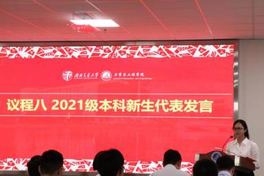 来自2021-01班的赵依然和2021-03班的魏淋杰作为本科生新生代表上台发言。