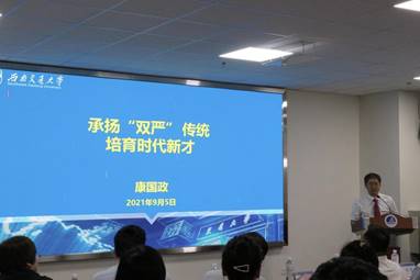 学院院长康国政介绍学院情况。康院长主要从学院架构、学院发展历程、师资力量、学科优势、科研成果、学生就业深造情况以及各类完备体系等方面详细展示了学院的雄厚力量。通过康院长的介绍,相信2021级新生们对学院有了更深的了解,也对自己未来的发展有了更清晰的定位。