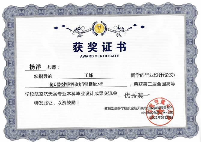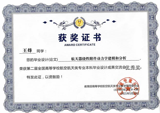 此外,在第二届全国高等学校航空航天类本科毕业设计成果交流会评选中,飞行器设计与工程专业的王烽同学获得了优秀奖。王烽同学的毕业论文题目是“航天器挠性附件动力学建模和分析”,指导教师是杨洋副教授。