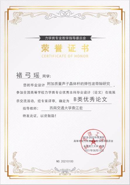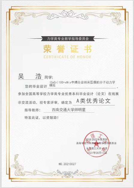 参与评选的三位同学均获评优秀论文。其中,吴浩同学的本科毕业论文“(CoCr)100-xNix中熵合金纳米压痕的分子动力学模拟”荣获A类优秀论文,褚弓瑶同学的本科毕业论文“附加质量声子晶体杆的弹性波带隙研究”以及李大鹏同学的本科毕业论文“导波在平板结构中传播的谱元法模拟及吸收边界实现”荣获B类优秀论文,他们的指导老师依次为师明星教授,袁江宏副教授以及苗鸿臣副教授。