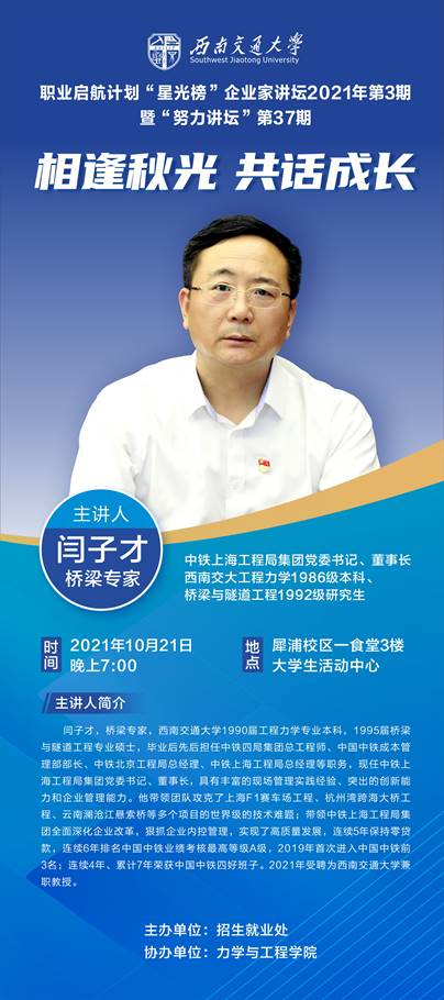 特聘教授闫子才院友做客“努力讲坛”第37期,受邀主讲 “相约秋光,共话成长”专题讲座。本次讲座由招生就业处主办,力学与工程学院承办。中铁上海工程局集团人力资源部及各子分公司负责人、优秀校友代表出席讲座,麻豆做爱