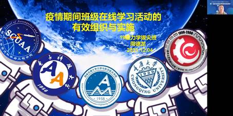 2019级力学拔尖班班长周德龙做了题为“疫情期间班级在线学习活动的有效组织与实施”的报告。他介绍了其班级在疫情期间为保证线上学习任务有序开展而举行的一系列活动。主要有:1.动起来2.学起来3.听起来4.码起来5.耍起来6.读起来;7.聊起来。通过一系列活动,该班疫情期间学习组织有条不紊,学习效果显著。四川大学季袁冬老师认为该班在疫情期间开展的一系列班级活动为各大高校如何在疫情中保持高效学习提供了典范和榜样,高度肯定了周德龙同学作为班长所起到的重要作用。