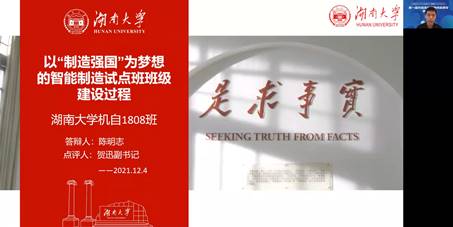 湖南大学机械设计制造及其自动化1808班班长陈明志做了题为“以‘制造强国’为梦想的智能制造试点班班级建设过程”的特邀报告。他介绍了本班的举措:1.班级建设轮流制;2.寝室片区责任制;3.定期举办党团活动;4.实行一对一导师制;5.献身志愿服务与抗疫工作;6.组建学习小组。通过以上努力,全班32人全部保研至名校。该院党委副书记贺迅老师说道:优秀的人在一起后会产生一些非常奇妙的化学反应。大家都很努力,不仅努力学习,努力生活,努力志愿服务,努力抗疫,努力在各个方面。希望他们到各校深造后继续发扬这个班的好传统,成长成为祖国需要的中坚力量!