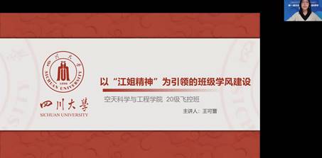 四川大学空天科学与工程学院2020级飞控班班长王可蕾做了题为“以‘江姐精神’为引领的班级学风建设”的报告。她介绍到,飞控班以“江姐精神”为引领,贯彻“空天报国”主线,积极开展“班团一体化建设”,深入开展思政教育类活动和学风引领类活动,取得了不错的成绩。接下来将从涵养家国情怀、传承江姐精神、立志空天报国等方面继续努力,持续提升班级凝聚力、战斗力!电子科大李孟老师对其班级开展班级学风建设活动的同时深挖班级精神内涵,将“江姐精神”融入到学风建设当中表示认同,并用“立大志,明大德,成大才,担大任”来激励该班同学们。
