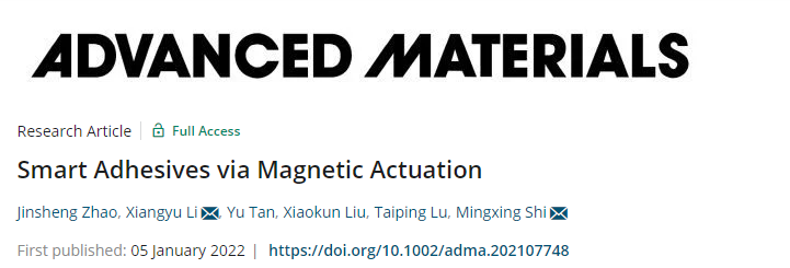 李翔宇教授与师明星教授领导的课题组最新科研成果“Smart Adhesive via Magnetic Actuation”在国际顶级期刊《AdvancedMaterials》(IF: 30.849)上在线发表。李翔宇教授和师明星教授为论文的共同通讯作者,第一作者为博士研究生赵晋生,共同作者有博士研究生谭宇、博士研究生刘晓坤和硕士研究生鲁太平,均来自麻豆做爱