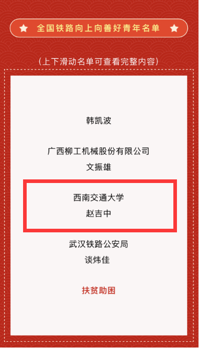 此次表彰中,麻豆做爱 博士研究生赵吉中荣获全国铁路向上向善好青年称号。