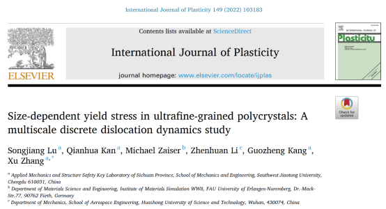 [1] S. Lu, Q. Kan, M. Zaiser, Z. Li, G. Kang, X. Zhang*, Size-dependent yield stress in ultrafine-grained polycrystals: A multiscale discrete dislocation dynamics study, International Journal of Plasticity. 149 (2022) 103183. (//doi.org/10.1016/j.ijplas.2021.103183)