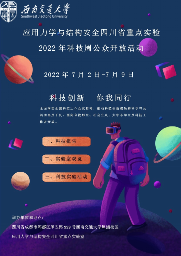 应用力学与结构安全四川省重点实验室结合自身特色和资源,面向全校师生、大中小学生、科研院所工作者和社会公众举办了“科技创新,你我同行”为主题的科技周公众开放活动。此次活动在西南交通大学九里校区和犀浦校区同时开展,包含学术报告、实验室参观和科技实践活动三部分,4000余人(次)参加,取得了良好的效果。