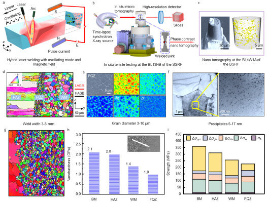 深入研究发现,细晶带内部的细小等轴非枝晶是以母材中高温稳定相经异质形核而成,适宜的温度梯度和熔池扰动共同决定了细晶带形成于HAZ区域。调节工艺参数能够改变细晶带的宽度,但无法完全消除细晶带。基于高分辨X射线原位多尺度关联成像技术,发现影响7050铝合金接头性能劣化的本质因素,探明了细晶带软化及沿晶失效机制,进而提出了一种全新的“激光扰动+磁场脉冲”联合制造策略,通过调控细晶带的区间分布,大幅提升了激光熔焊接头的强韧性,高于搅拌摩擦焊。相关成果以题为“Inhibiting weld cracking in high-strength aluminium alloys”发表在Nature Communications上,第一作者为西南交大牵引动力国家重点实验室胡雅楠博士(现为麻豆做爱