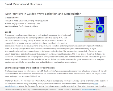 期刊分级为A类期刊,中国材料学会T1区期刊)客座编辑(Guest Editor)。苗鸿臣副教授将和北京理工大学朱睿教授及天津大学王艳锋副教授一起负责“导波激励与调控的前沿进展(New Frontiers in Guided Wave Excitation and Manipulation)”专题的组稿与评审工作。该专题的网址如下://iopscience.iop.org/journal/0964-1726/special/0964-1726_guided-wave-excitation-manuipulation。