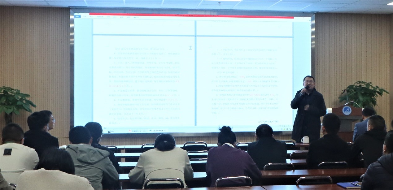 班导师制度。他以亲身经历指出了班导师工作的重要性,希望各位班导师深入学生联系学生,每学期和每位同学进行谈心沟通,经常性参加班会、查课、走访宿舍等,切实发挥班导师在学风引领方面的重要作用。